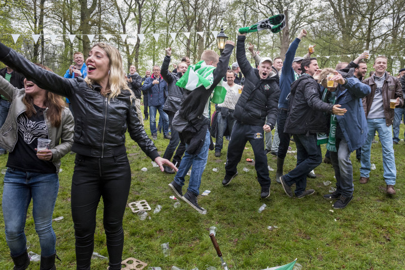 Na het tweede doelpunt in de bekerfinale PEC Zwolle – FC Groningen op groot scherm, podium Nienoord, Leek.
